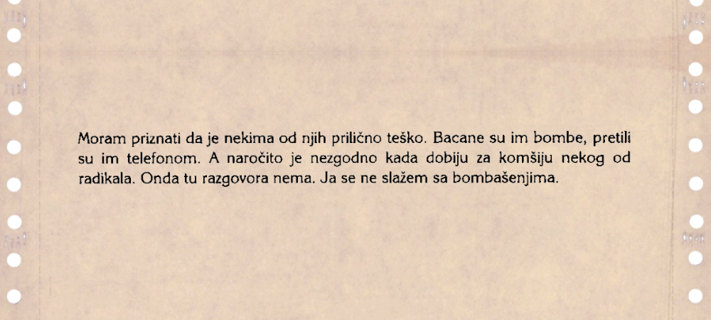 „[T]reba svakoj izbegloj srpskoj porodici da damo adresu jedne hrvatske porodice. Daće milicija, milicija će raditi onako kako vlast odluči, a mi ćemo uskoro biti vlast. Lepo, sve izbegle srpske porodice će doći na hrvatska vrata i zatečenim Hrvatima dati svoje adrese u Zagrebu i u drugim hrvatskim mestima. Hoće, hoće. Biće dovoljno autobusa, izvešćemo ih na granicu srpske zemlje, odatle peške neka produže, ako sami ne odu.“