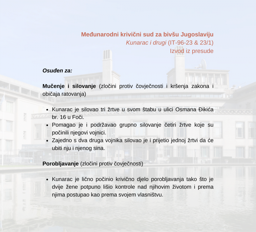 Pravosnažno je osuđen (2002.) pred Međunarodnim krivičnim sudom za bivšu Jugoslaviju (MKSJ) za mučenje, silovanje i porobljavanje kao zločin protiv čovečnosti i ratni zločin, na 28 godina zatvora. Kaznu izdržava u Nemačkoj. U februaru 2017. godine, Mehanizam za međunarodne krivične sudove (MMKS) odbio je molbu za prevremeno puštanje Kunarca na slobodu.
