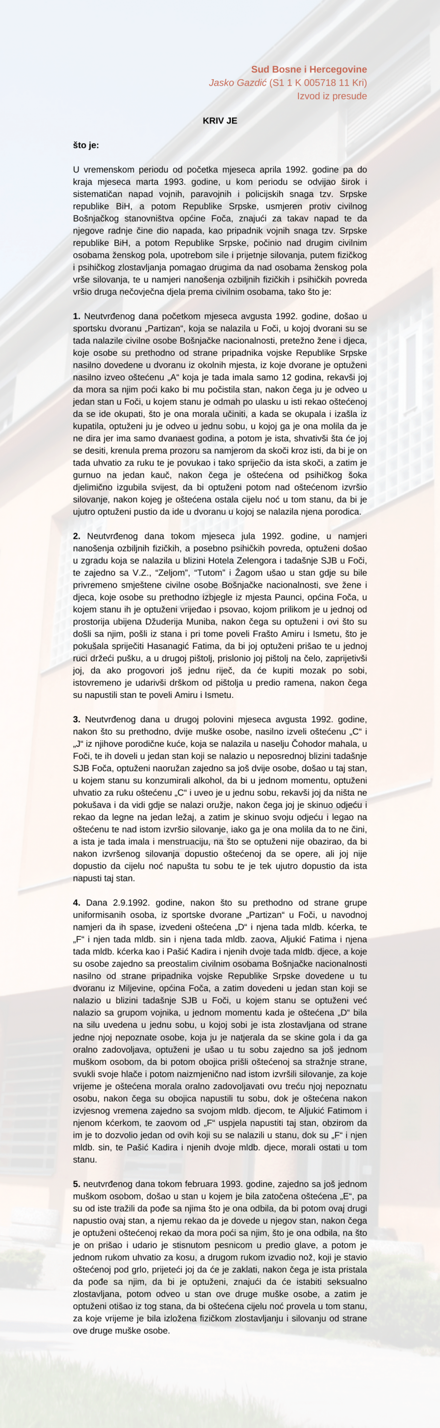 Pravosnažno je osuđen (2013.) pred Sudom Bosne i Hercegovine za silovanje kao zločin protiv čovečnosti i druga nečovečna dela, učinjena u nameri nanošenja velike patnje, ozbiljne fizičke ili psihičke povrede ili narušenja zdravlja, na kaznu zatvora u trajanju od 17 godina, koju izdržava u Zavodu za izvršenje krivičnih sankcija Bosne i Hercegovine u Lukavici, pored Sarajeva.