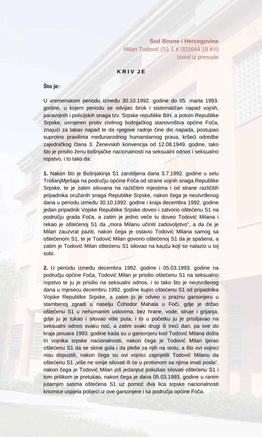 Pravosnažno je osuđen (2019.) pred Sudom Bosne i Hercegovine za silovanje kao zločin protiv čovečnosti, na kaznu zatvora u trajanju od 10 godina, koju izdržava u Zavodu za izvršenje krivičnih sankcija Bosne i Hercegovine u Lukavici, pored Sarajeva.