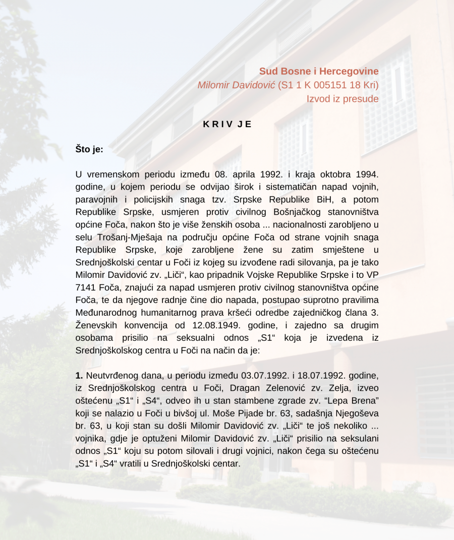 Pravosnažno je osuđen (2019.) pred Sudom Bosne i Hercegovine za silovanje kao zločin protiv čovečnosti, na kaznu zatvora u trajanju od sedam godina, koju izdržava u Zavodu za izvršenje krivičnih sankcija Bosne i Hercegovine u Lukavici, pored Sarajeva.