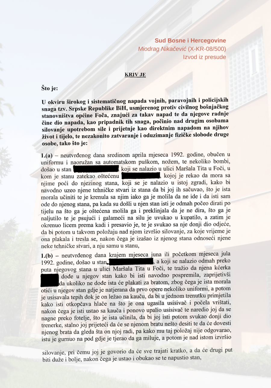 Pravnosnažno je osuđen (2010.) pred Sudom Bosne i Hercegovine za silovanje kao zločin protiv čovečnosti, na kaznu zatvora u trajanju od 10 godina.