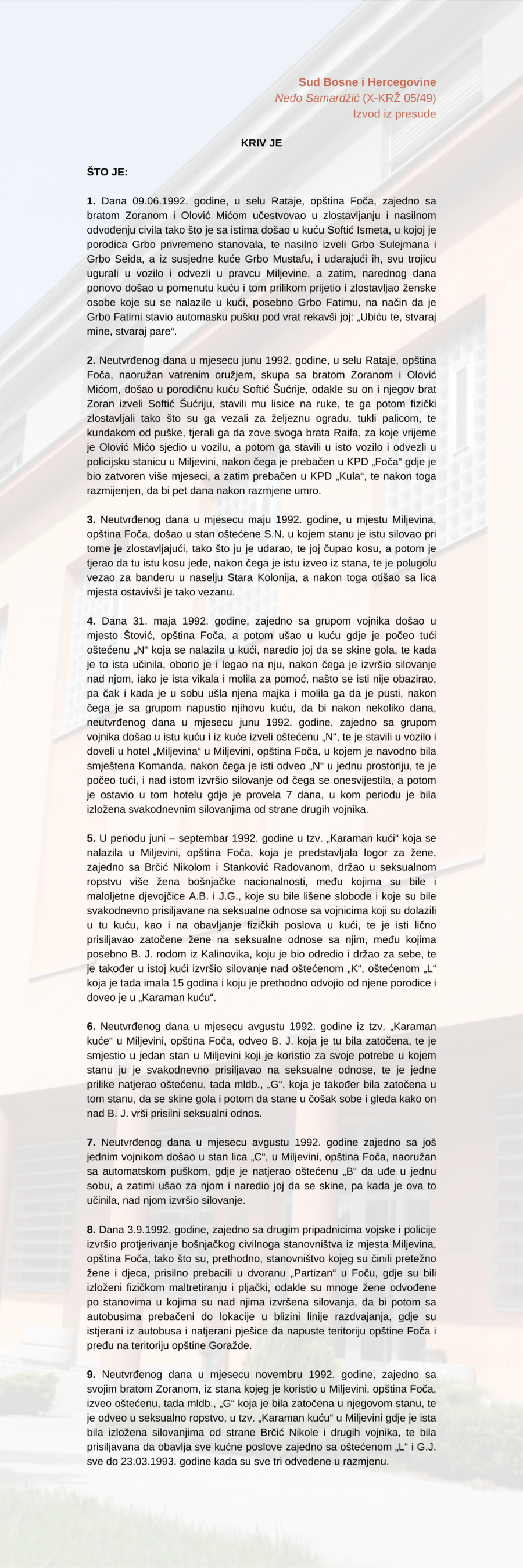 Pravosnažno je osuđen (2006.) pred Sudom Bosne i Hercegovine za zločine protiv čovečnosti: progon; deportaciju ili prisilno preseljenje stanovništva; oduzimanje fizičke slobode suprotno osnovnim pravilima međunarodnog prava; silovanje i druga nečovečna dela slične prirode, učinjena u nameri nanošenja velike patnje, ozbiljne fizičke ili psihičke povrede ili narušenja zdravlja, na kaznu zatvora u trajanju od 24 godine, koju izdržava u Zavodu za izvršenje krivičnih sankcija Bosne i Hercegovine u Lukavici, pored Sarajeva.