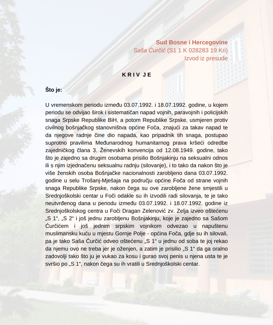 Pravosnažno je osuđen (2020.) pred Sudom Bosne i Hercegovine za silovanje kao zločin protiv čovečnosti, na kaznu zatvora u trajanju od pet godina, koju izdržava u Zavodu za izvršenje krivičnih sankcija Bosne i Hercegovine u Lukavici, pored Sarajeva.
